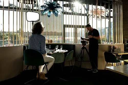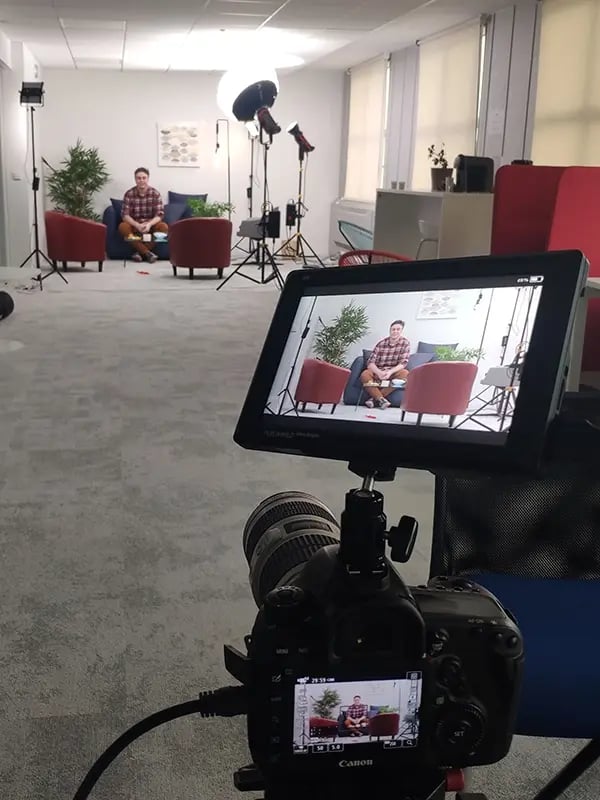 Puisque le temps de votre client est précieux on s’arrange pour tout filmer en une 1/2 journée. On démarre avec l’interview : notre réalisateur sera un vrai “coach” pour l’aider à sortir son discours mais surtout pour se tenir correctement (le non-verbal…). Dans 90% des cas, nous interviewons des gens qui passent pour la 1ère fois devant la caméra : nous savons les mettre à l’aise.